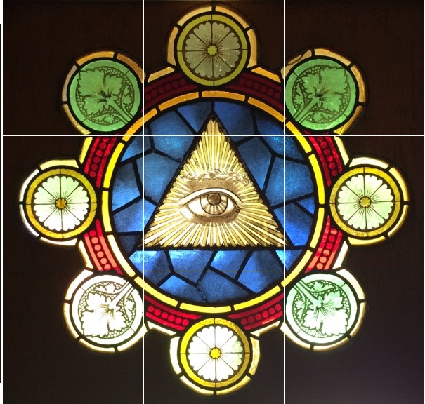 In design terms, the Wizard’s tastes skewed toward the epic, the ornate — total art! cosmic syncretism! He hung large antique mirrors on walls in three of the home’s rooms; he filled most of the home’s windows with stained glass, including a large window at the front of the house featuring an image of the Eye of Providence — the latter retrieved, I’m told, from either a former church or a former Masonic Temple. From the ceilings of those of the home’s rooms adorned with foxed mirrors, he added dazzling, many-armed, many-bulbed chandeliers — beautiful, gaudy, dusty old things! The home’s several built-in bookcases may have been of his making as well — as were one room’s shelves sized for storage of records. The most characteristic of his contributions, though, was the imp crouched atop the home’s door bell, or the pair of werewolves carved into the corners of a mantle atop one room’s fireplace.